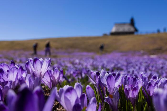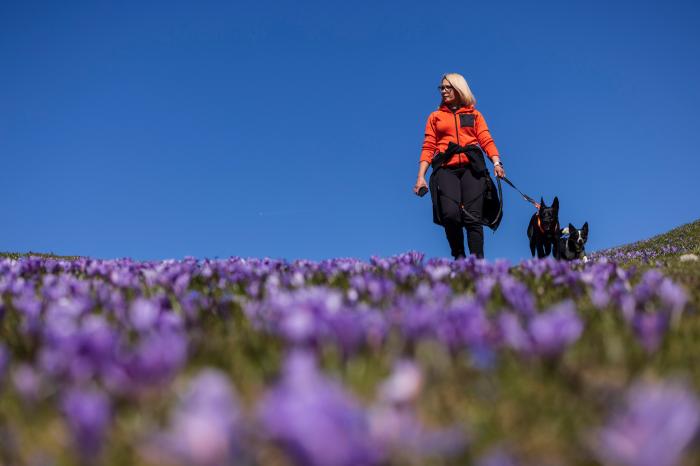 4月24日,在斯洛文尼亚卡姆尼克山区的高山牧场上,游客游览番红花海。