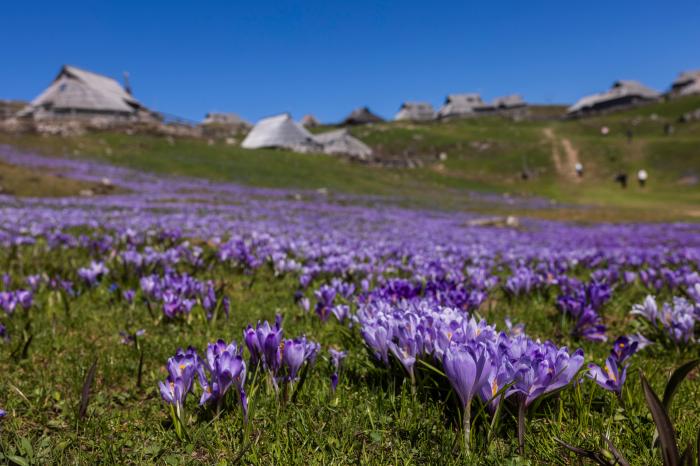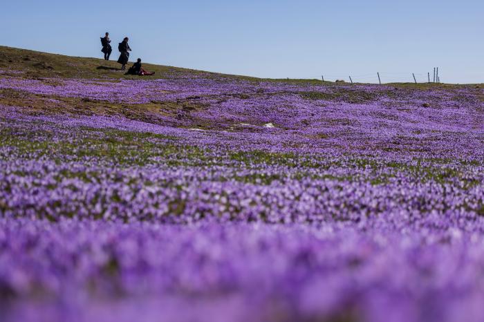 近日,在斯洛文尼亚北部卡姆尼克山区的高山牧场上,紫色的番红花盛开,形成了一幅美丽的草甸花海画卷。