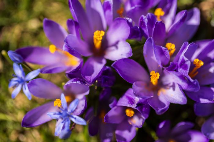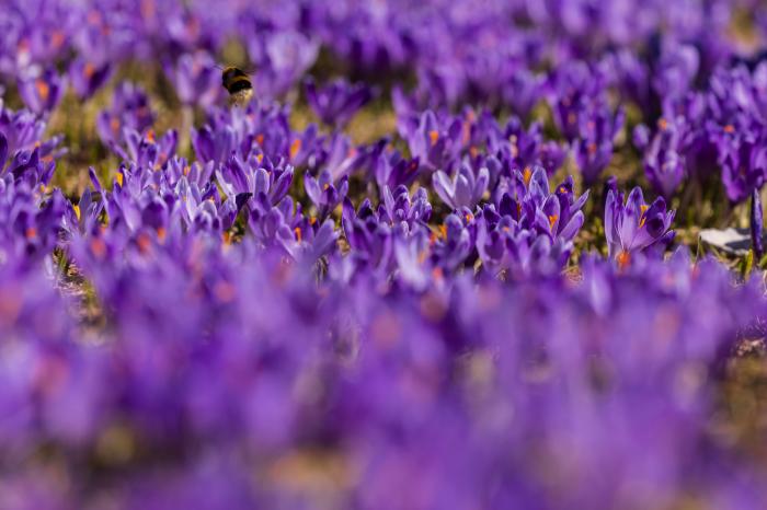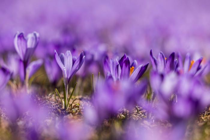 4月24日,在斯洛文尼亚卡姆尼克山区的高山牧场上,番红花在盛开。
