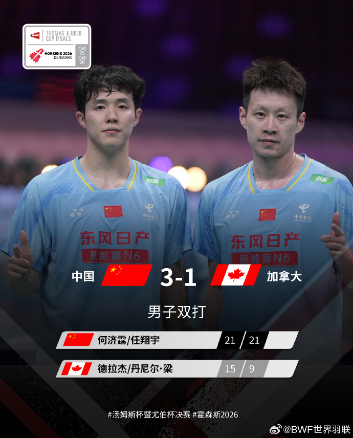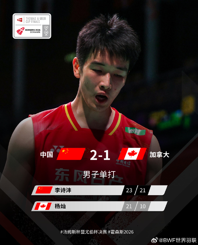 北京时间4月27日下午,2026汤姆斯杯世界羽毛球男子团体锦标赛在丹麦霍森斯结束了A组一场小组赛的较量,中国队以4比1击败加拿大队,两战两胜,顺利从小组赛中晋级。中国队丢掉的一盘比赛是世锦赛冠军、担当第一单打的石宇奇因突发身体不适,放弃了与加拿大队一单赖浩俊的比赛造成的,不过因为两队整体实力相差悬殊,石宇奇退赛并未影响到中国队的小组出线大局。