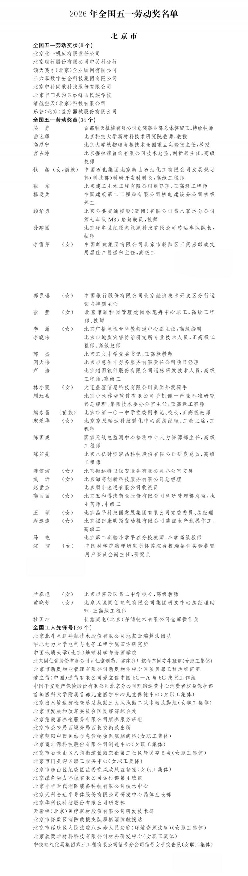 北京市8个单位荣获全国五一劳动奖状、34名职工荣获全国五一劳动奖章、26个集体荣获全国工人先锋号。