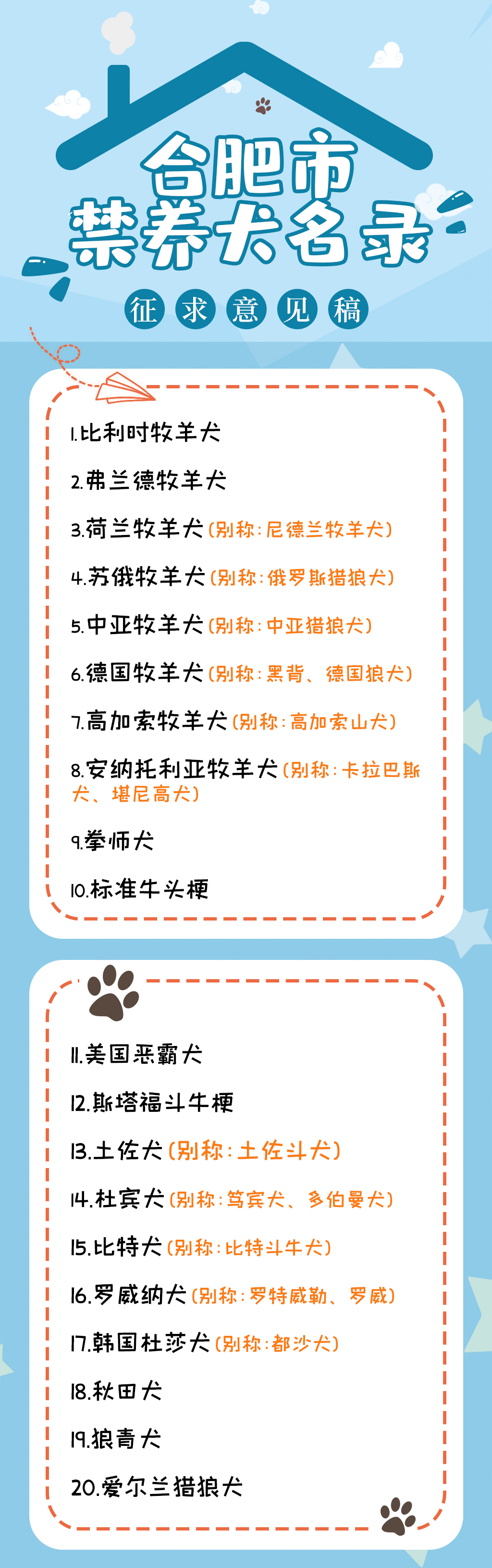 《合肥市养犬管理条例》(以下简称《条例》)已由合肥市第十六届人民代表大会常务委员会第十四次会议于2019年12月24日通过,安徽省第十三届人民代表大会常务委员会第十七次会议于2020年3月27日批准,自2020年6月1日起施行。根据《条例》第十条之规定,禁养犬名录由市公安机关、市农业农村部门确定,并向社会公布。经市公安局、市农业农村局会同相关行业协会、部分人大代表、政协委员、居民代表充分讨论论证后,确定了禁养犬范围。