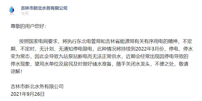 吉林市新北水务有限公司9月26日发布公告,按照国家电网要求,将执行东北电管局和吉林省能源局有关有序用电的精神,不定期、不定时、无计划、无通知停电限电,此种情况将持续到2022年3月份,停电、停水变为常态,因此会导致九站泵站断电而无法正常供水,近期会经常出现因停电导致的停水现象,望用水单位及居民及时做好储水准备,随手关闭水龙头,不便之处,敬请谅解。