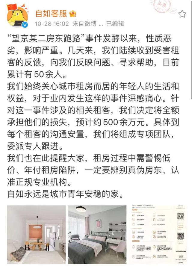 随后,自如客服官微也回应此事称,“望京某二房东跑路”事件发酵以来,性质恶劣,影响严重。几天来,自如陆续收到受害租客反映问题、寻求帮助,目前累计有50余人。