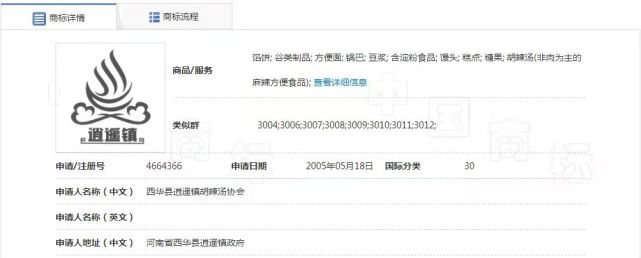 北青-北京头条记者查询中国商标网发现,西华县逍遥镇胡辣汤协会注册了多个跟逍遥镇有关的商标,其中2003年申请在第29类上注册了“逍遥镇”商标,商品/服务为胡辣汤;2005年在第30类申请注册了“逍遥镇”商标,商品/服务为馅饼、谷类制品、胡辣汤(非肉为主的麻辣方便食品)等。