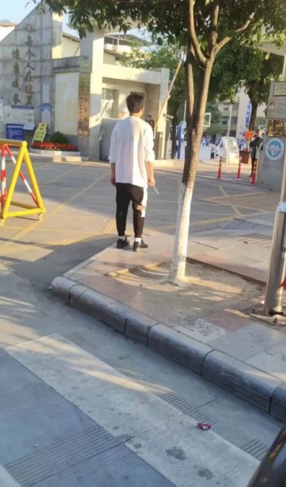 据了解,这段视频记录的时间是11月29日下午4时50分左右,一名身穿白色上衣男子持刀出现在罗城中学校门外。