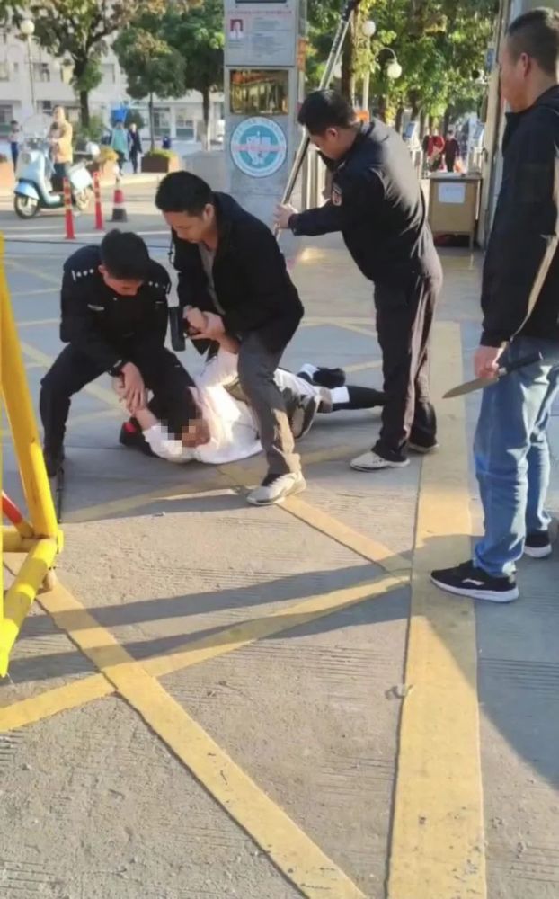 视频画外音称,“4时50分,人(白衣男子)出来了,手里拿着刀,保安看到男子持刀站在学校门口却无动于衷。一名女子和保安讲了男子手里有一把刀,保安也不去拿防护器材做准备,还在那里叉腰看,之后慢慢吞吞走进门卫室。随后男子又冲向校门一侧踢了一个人,保安却还是防护器材也不拿,防护措施也没有。一个小孩和他父母都惊魂吓跑了,保安却一直在看,都不知道他们平时是怎么培训的。之后男子又再次持刀出现在校门外。巡逻民警发现后立即上前将其控制,城管的也上前帮忙。直到这时保安还没有出来。最后人被控制住了,保安才拿着防护器材出来。”