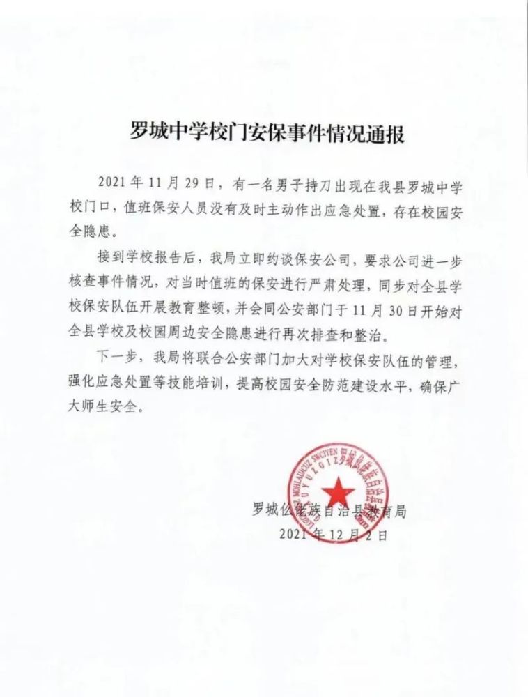 12月2日,罗城仫佬族自治县教育局发布了罗城中学校门安保事件情况通报。通报称,11月29日,有一名男子持刀出现在我县罗城中学校门口,值班保安人员没有及时主动作出应急处置,存在校园安全隐患。