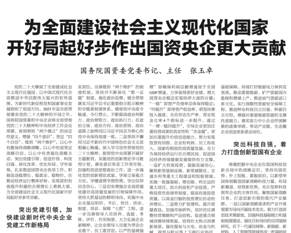 今年2月,国务院国资委党委书记、主任张玉卓曾在《学习时报》撰文,文章的标题是《为全面建设社会主义现代化国家开好局起好步作出国资央企更大贡献》。