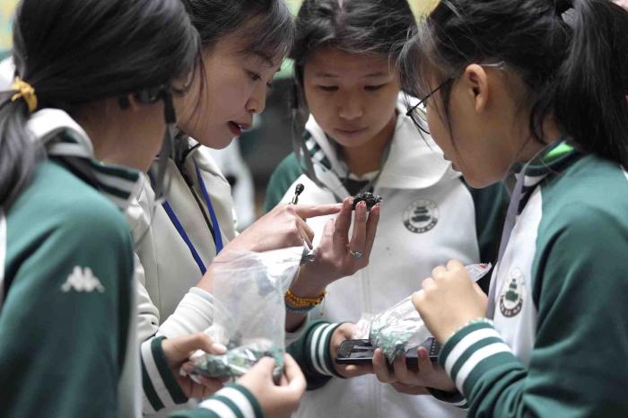 11月12日上午,北京中学生研学团走进湖北十堰云盖寺绿松石国家矿山公园,变身“探宝猎人”现场挖矿,收获绿松石。在矿山博物馆,学生们参观了解云盖寺绿松石矿的历史渊源与发展历程,欣赏精美的绿松石制品。