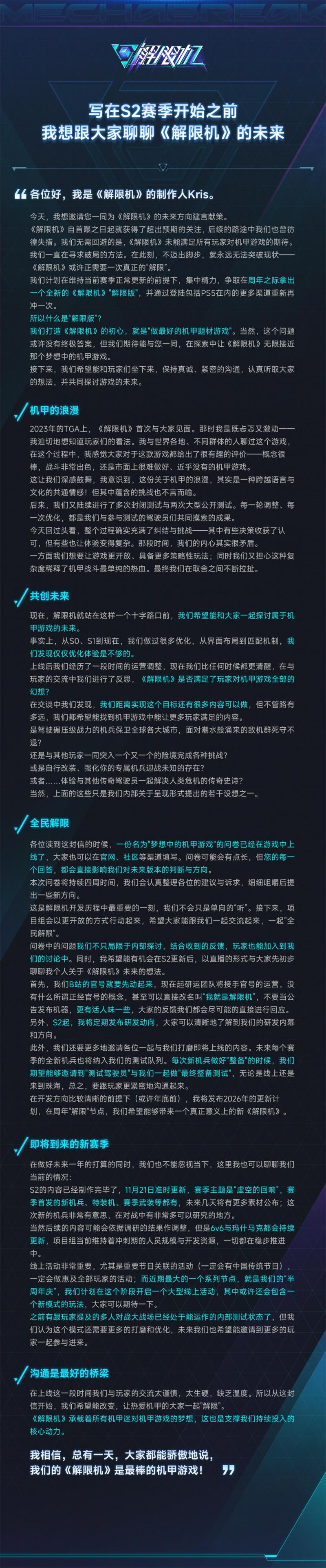 在公开信的结尾,Kris再次回归到“机甲的浪漫”这一共同情感,他表示《解限机》承载着所有机甲迷的梦想,并呼吁玩家与开发团队一起推动这场“全民解限”,共同打造属于每位玩家的梦想机甲之作。