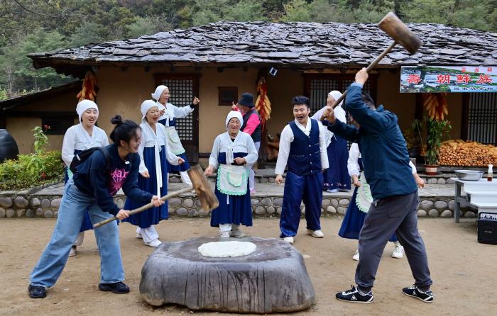 10月12日,游客(前)在辽宁省丹东市的三道河朝鲜族民俗村体验制作打糕。新华社记者 吴青昊 摄