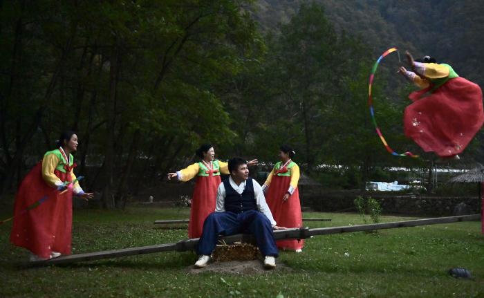 10月12日,朝鲜族村民在辽宁省丹东市的三道河朝鲜族民俗村为游客表演跳跷跷板。新华社记者 吴青昊 摄