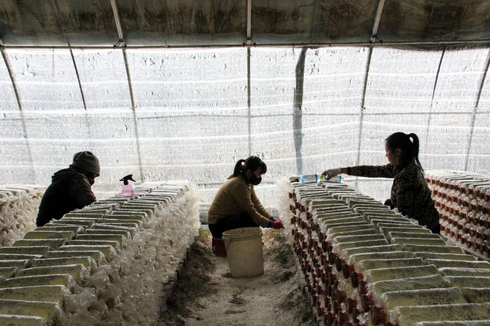 11月4日,在吉林省白山市长白朝鲜族自治县马鹿沟镇南尖头村白灵菇种植基地,农户在培育菌包。新华社记者 张楠 摄