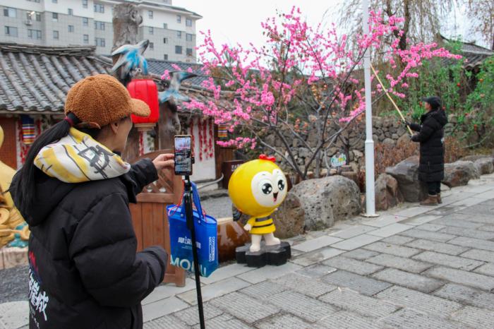 11月4日,在吉林省白山市长白朝鲜族自治县千年崖城景区,工作人员直播介绍景区特色。新华社记者 张楠 摄