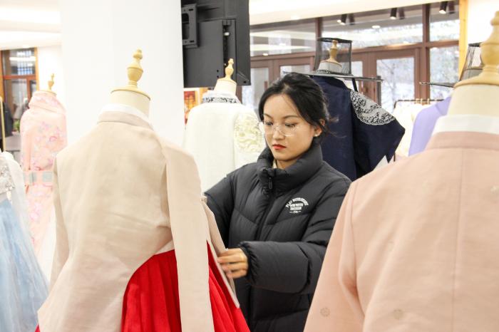 11月4日,游客在吉林省白山市长白朝鲜族自治县千年崖城景区挑选民族服饰。新华社记者 张楠 摄