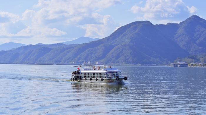 10月13日,游客在G331辽宁丹东段沿线的宽甸河口景区乘坐游船游览鸭绿江。新华社记者 吴青昊 摄