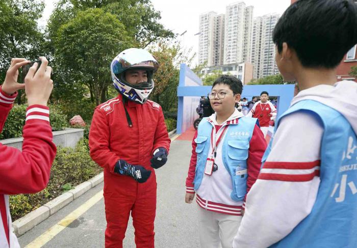 现场展出学院学生自己研发制作的赛车,研学团学生还体验了赛车并与赛车手互动。
