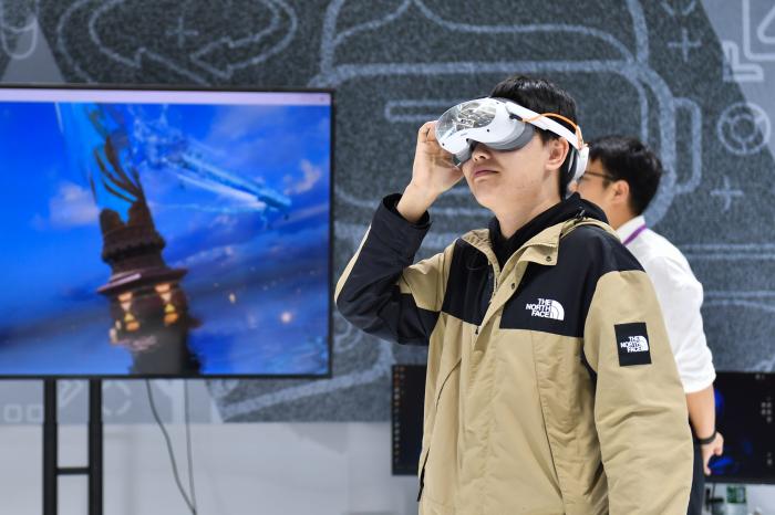 11月12日,观众在2025中国新媒体技术展上体验VR眼镜。