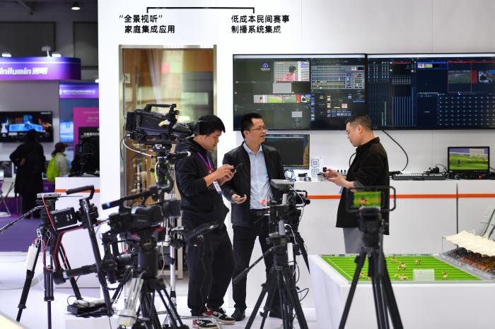11月12日,观众在2025中国新媒体技术展上了解拍摄、转播设备。