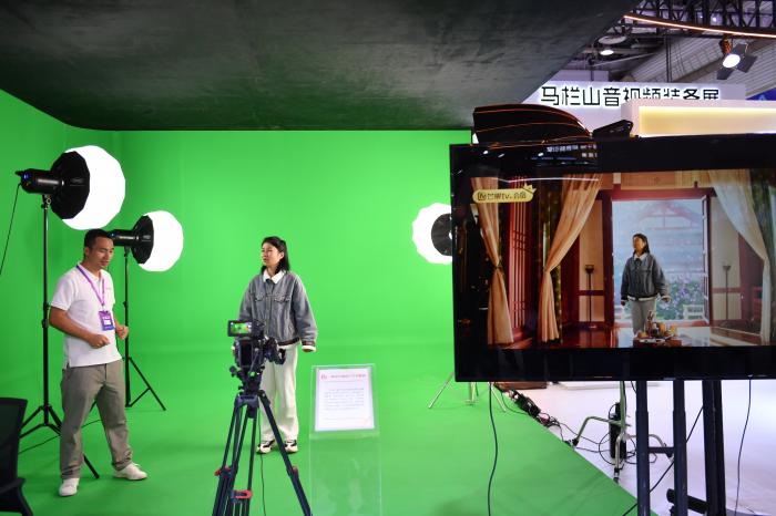 11月12日,观众在2025中国新媒体技术展上体验虚拟片场线下打卡系统。