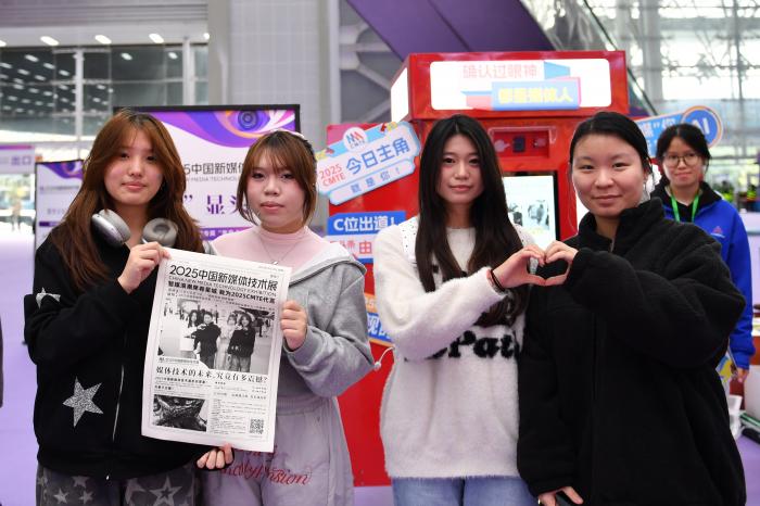 11月12日,观众在2025中国新媒体技术展上体验“互动拍报机”。