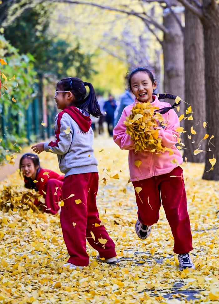 11月12日,三名小女孩在北京西城区什坊小街旁抛起银杏落叶。新华社记者 陈晔华 摄