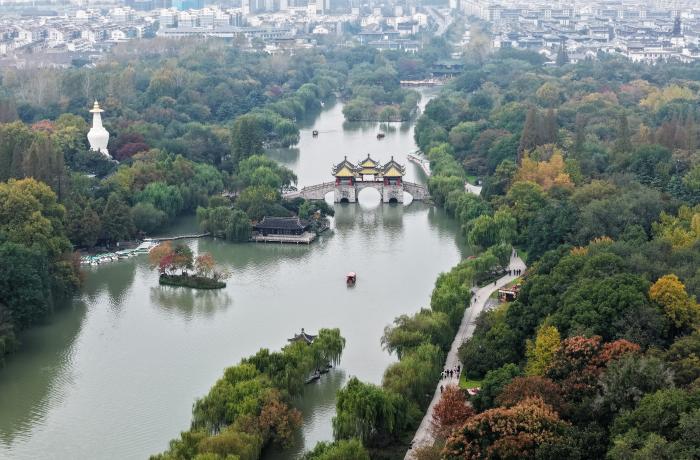 11月12日拍摄的江苏扬州瘦西湖风景区初冬景色(无人机照片)。新华社发(孟德龙摄)