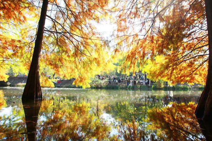 11月12日,游客在南京莫愁湖公园赏景游玩。新华社发(苏阳摄)