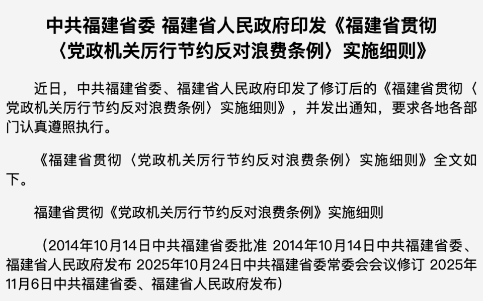 12月29日,《福建日报》发布消息称,近日,中共福建省委、福建省人民政府印发了修订后的《福建省贯彻〈党政机关厉行节约反对浪费条例〉实施细则》。