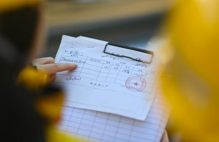 今年47岁的孟庆艳是天津港第一港埠有限公司理货中心甲班的值班主任。据她介绍,甲班一共有32名职工,其中女性理货员28名,元旦假期期间,她们几乎全员在岗,保障着码头货场的正常运转。1月2日,在天津港第一港埠有限公司的码头货场,孟庆艳在核对货物的货号。新华社记者 赵子硕 摄