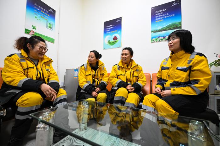 1月2日,在天津港第一港埠有限公司码头,孟庆艳(右)和同事在休息时聊天。