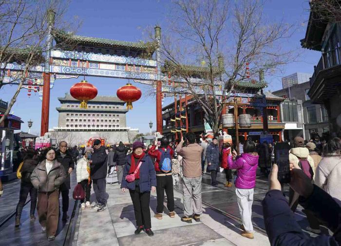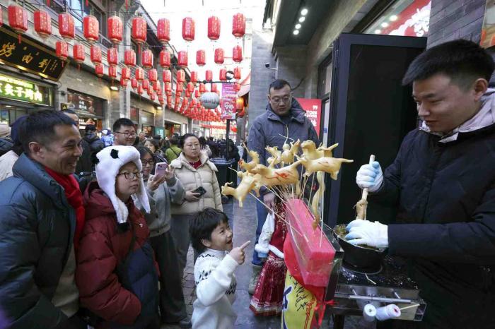 2月17日,游客来到以“福马迎春——前门新春美食‘妙’荟”为主题的新春美食文化盛宴在前门大街享受着春节假期,活动将持续至3月3日(正月十五)。前门“福马迎春——前门新春美食‘妙’荟”以美食为核心亮点,以味觉牵引非遗、科技与冰雪体验,通过五大“妙”趣板块,打造京城年味最浓、烟火气最旺的特色新春盛会。