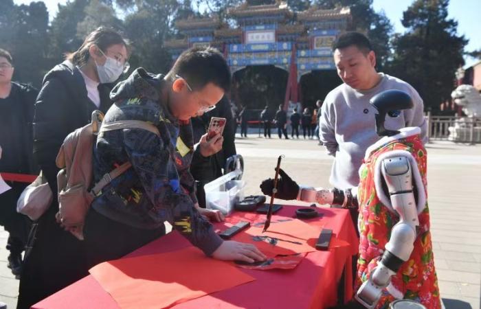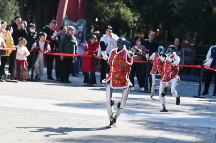 智能机器人在观德殿院落内挥毫写福,在寿皇殿广场带来舞蹈表演,吸引众多游客驻足。
