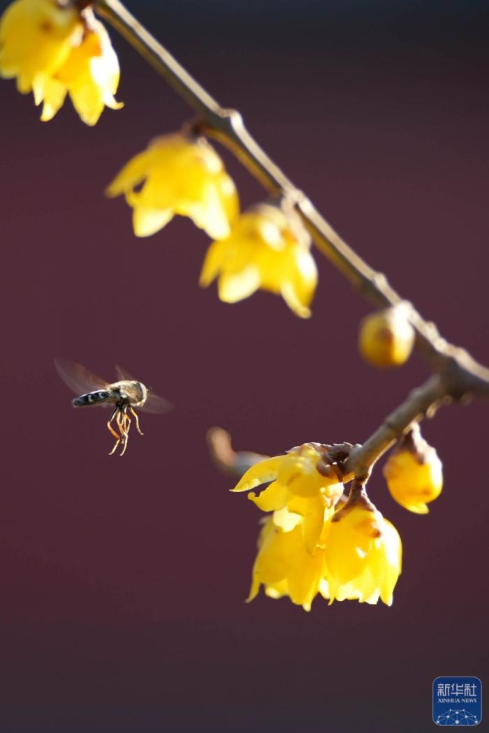 近日,北京卧佛寺内蜡梅花盛开,引蜂花间采蜜。许多游客前来打卡拍照。
