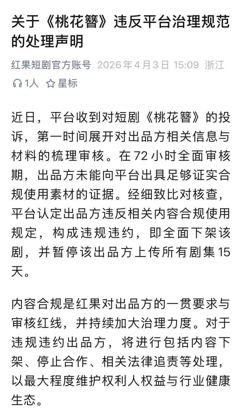 4月3日,红果短剧官方发布处理声明,针对平台内短剧《桃花簪》涉嫌素材使用违规问题作出正式处置,决定全面下架该剧,并对涉事出品方采取暂停上传所有剧集15天的处罚措施。