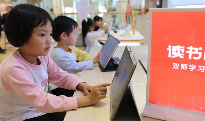 4月3日,四川省宜宾市长宁县的小朋友在新华文轩阅读电子书。新华社发(刘龙泉摄)