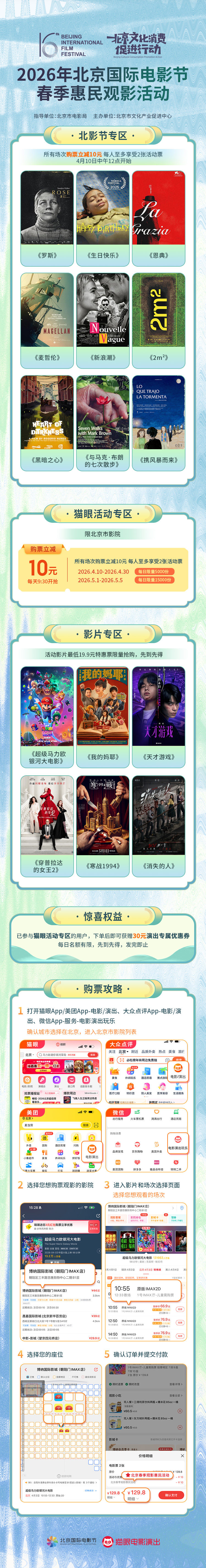 为给广大市民及影迷在第十六届北京国际电影节期间带来切实的观影实惠和便捷友好的活动体验,4月10日至5月5日,北京文化消费促进行动北京国际电影节春季惠民观影活动将正式开展。活动预计投放惠民补贴500万元,推出购票立减、影片专区、北影节专区、演出权益四大惠民举措。