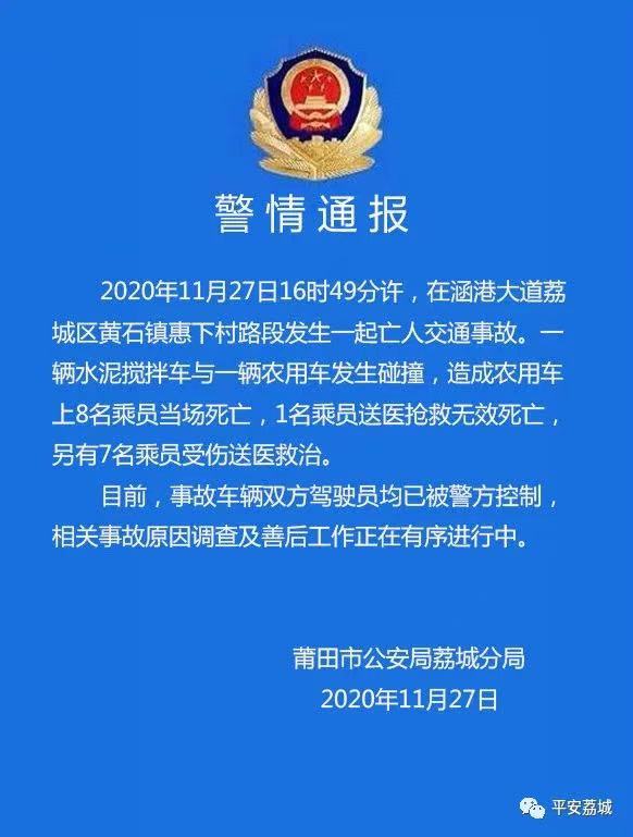 据福建莆田市公安局荔城分局11月27日晚通报,11月27日16时49分许,在涵港大道荔城区黄石镇惠下村路段发生一起亡人交通事故。一辆水泥搅拌车与一辆农用车发生碰撞,造成农用车上8名乘员当场死亡,1名乘员送医抢救无效死亡,另有7名乘员受伤送医救治。