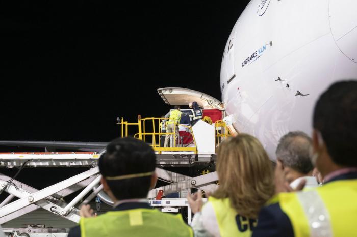 2月23日,在多米尼加首都圣多明各国际机场,工作人员运输装有中国科兴新冠疫苗的温控集装箱。多米尼加从中国采购的科兴新冠疫苗2月23日晚运抵多首都圣多明各,多米尼加副总统培尼亚等多位高级别官员在机场迎接。