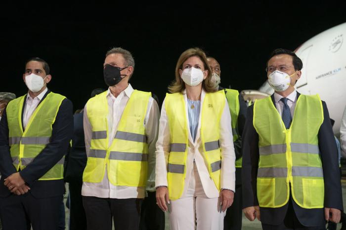 2月23日,多米尼加副总统培尼亚(前右二)等在首都圣多明各国际机场迎接中国科兴新冠疫苗。