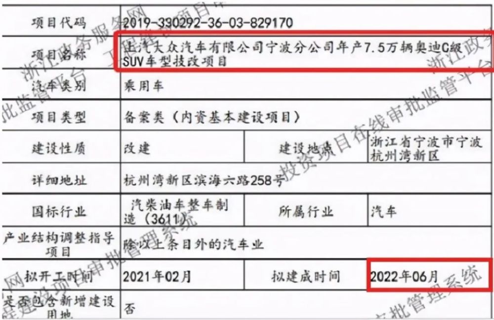 上汽奥迪的野心不止于此,除了对奥迪A7进行国产外,更是要对奥迪中大型SUV实现国产化。早在去年就有消息称上汽大众汽车有限公司宁波分公司申请奥迪C级SUV技改项目,规划年产能为7.5万辆。项目拟今年2月开工,并于6月建成。