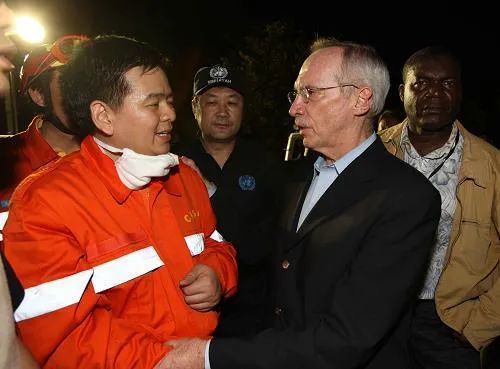 2010年1月14日,联合国秘书长助理埃德蒙·穆勒(右)与中国国际救援队领队黄建发交谈。穆勒感谢中国政府及时派出救援队到海地进行救援