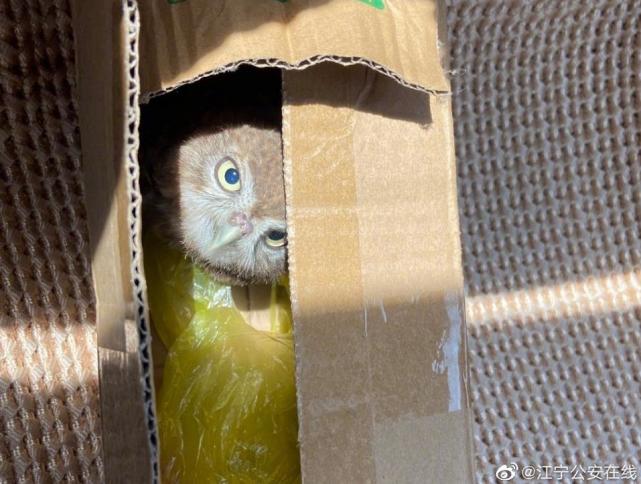 接到报警后,淳化派出所民警迅速赶往居民家,小猫头鹰被放在纸箱中。小猫头鹰的身体无明显外伤,但由于年龄过小,尚不能飞行。民警带着小猫头鹰回到报警人捡到小猫头鹰的地点,但未能找到猫头鹰的巢穴及家人。民警随即将小猫头鹰送至红山动物园南京市野生动物收容救护中心。