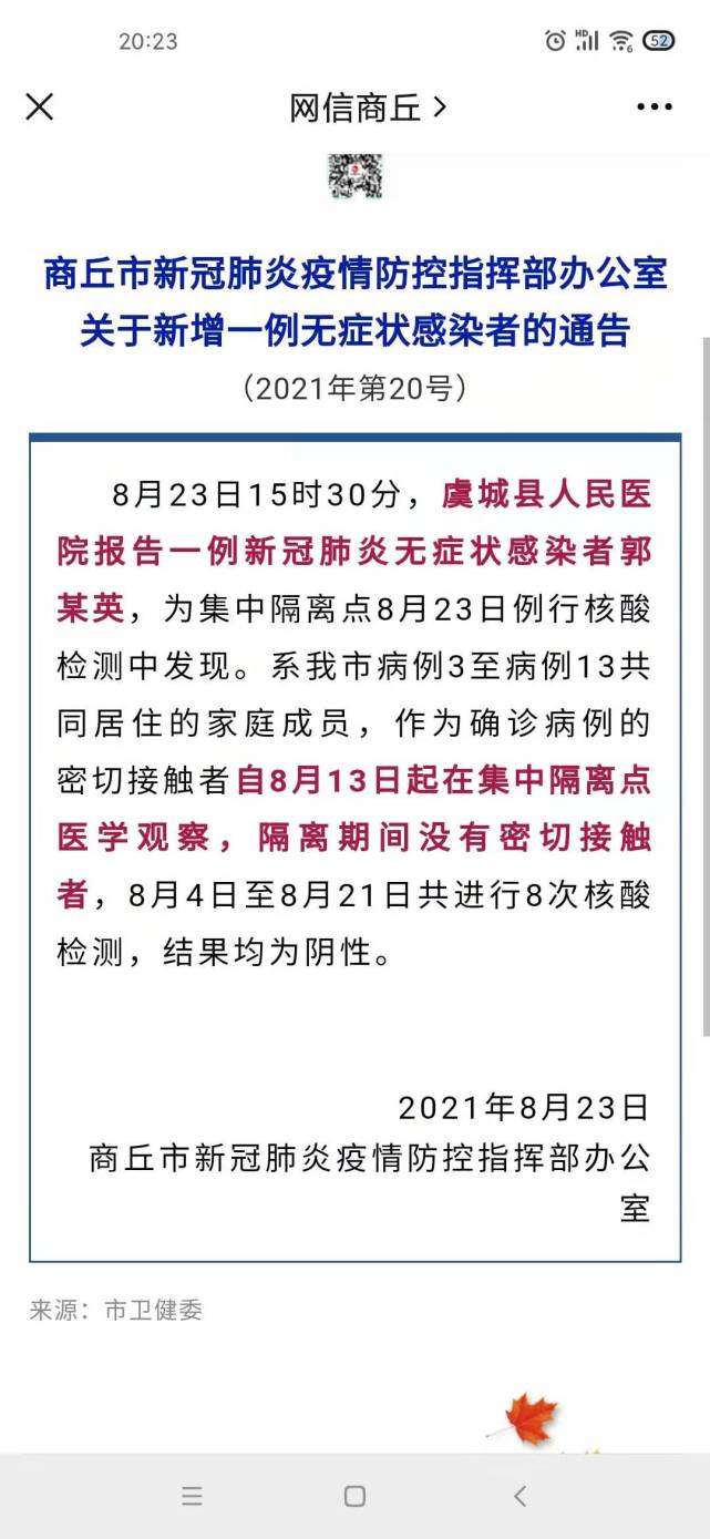 据河南商丘市新冠肺炎疫情防控指挥部办公室消息,8月23日15时30分,虞城县人民医院报告一例新冠肺炎无症状感染者郭某英,为集中隔离点8月23日例行核酸检测中发现。系商丘市病例3至病例13共同居住的家庭成员,作为确诊病例的密切接触者自8月13日起在集中隔离点医学观察,隔离期间没有密切接触者,8月4日至8月21日共进行8次核酸检测,结果均为阴性。