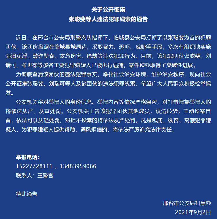 强迫卖淫、敲诈勒索 河北邢台警方打掉一犯罪团伙,公开征集违法犯罪线索