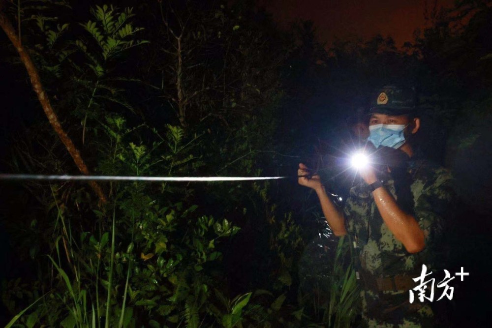清晨,笔者再一次跟随官兵上山搬运走私工具。走私窝点对面是香港新桂田村红花岭山头,两山直线距离不到一公里。借着夜幕,走私通道一旦架设成功,不到一分钟便能完成货物的空运。