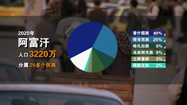 阿富汗民族结构十分复杂。2020年阿富汗总人口3220万,分属20多个民族,其中普什图族占40%,塔吉克族占25%,哈扎拉族占9%、乌兹别克族占9%、土库曼族占3%、俾路支族占2%。