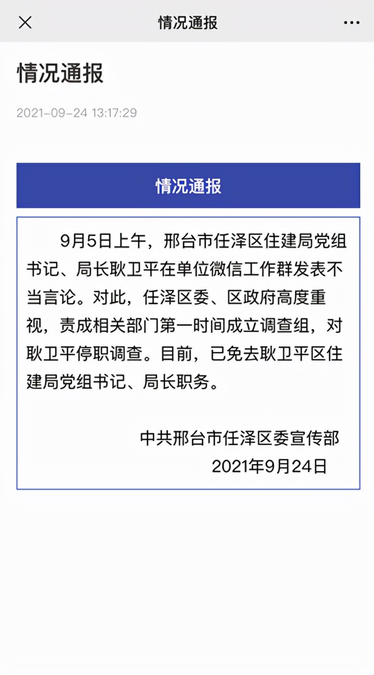 9月24日,邢台任泽区委宣传部发出官方通报:9月5日上午,邢台市任泽区住建局党组书记、局长耿卫平在单位微信工作群发表不当言论。对此,任泽区委、区政府高度重视,责成相关部门第一时间成立调查组,对耿卫平停职调查。目前,已免去耿卫平区住建局党组书记、局长职务。