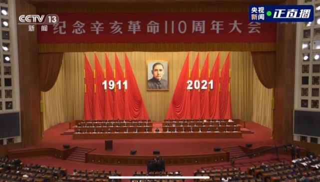 人民大会堂大礼堂会场主席台上方悬挂着“纪念辛亥革命110周年大会”的会标,主席台后幕墙正中悬挂着孙中山先生的巨幅照片,两侧各立5面红旗,红旗前分别悬挂字标“1911”、“2021”。